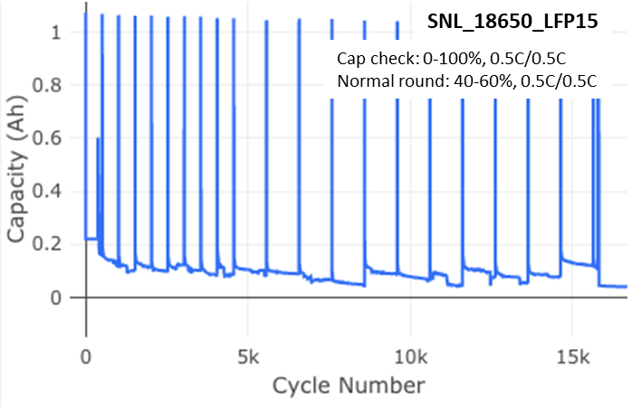 A round of cycling for each cell varied from 125 to 1000 cycles, depending on the rate of degradation at the specific test conditions. The cycle count for a round was halved if a cell experienced over 5% capacity loss in the previous round. These adjustments were intended to offer enough granulation in the capacity decline curve to enable observation of any changes in mechanism, while still maintaining a reasonable check-up frequency during a nearly three-year study.